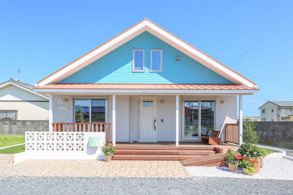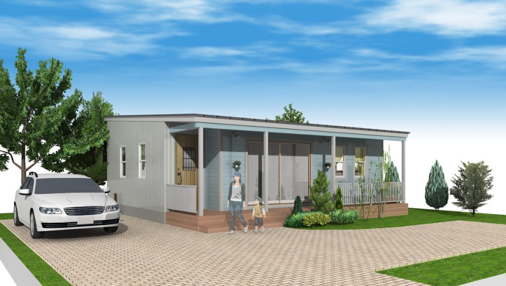 S-CRAFTの建坪20坪のコンパクトハウスは、外観は海沿いに合う大屋根と大きなカバードポーチが特長。